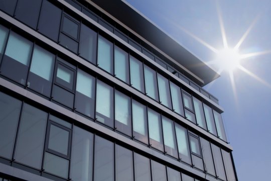 Ein Rollo bietet effektiven Hitze- und Blendschutz an großzügig verglasten Gebäuden